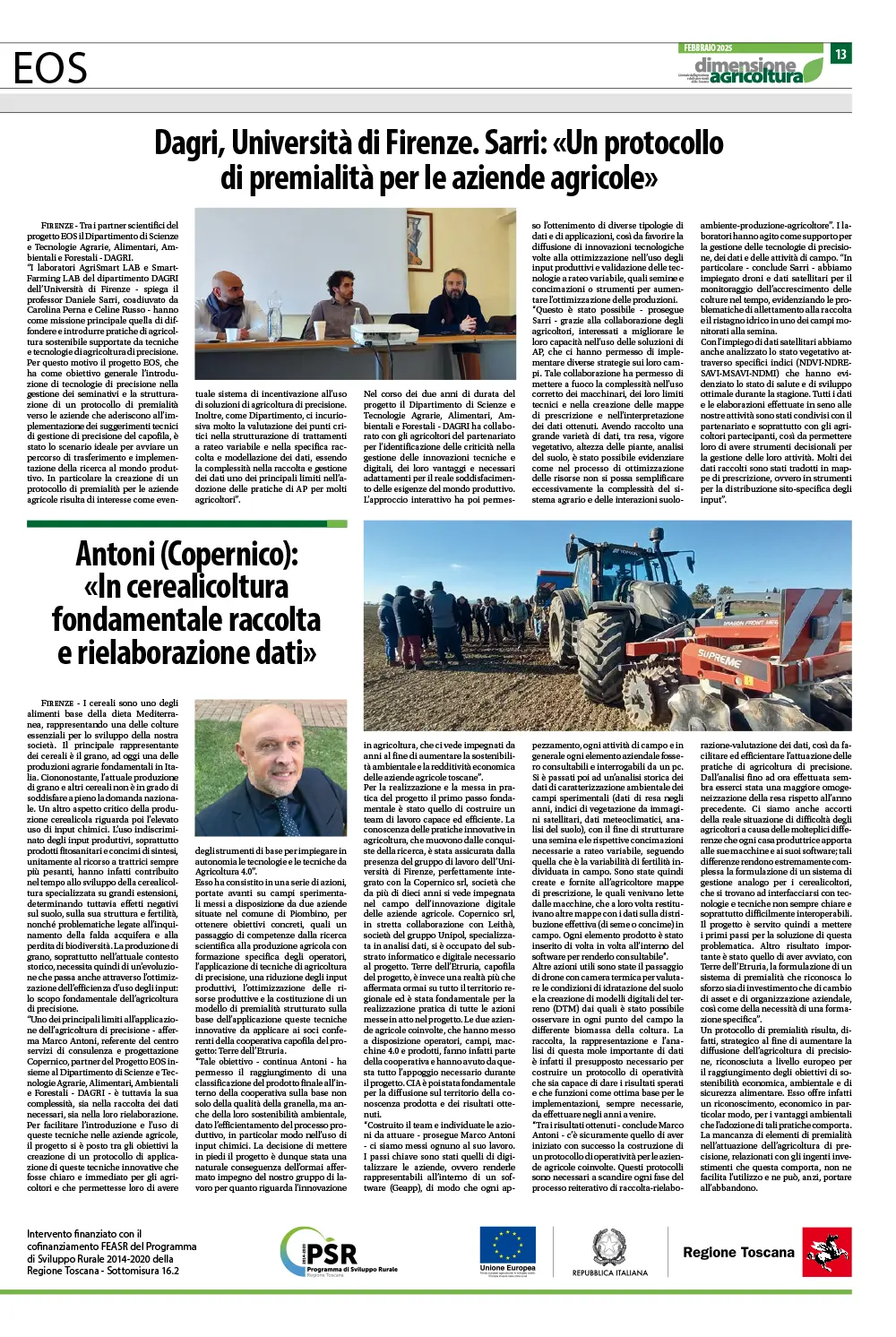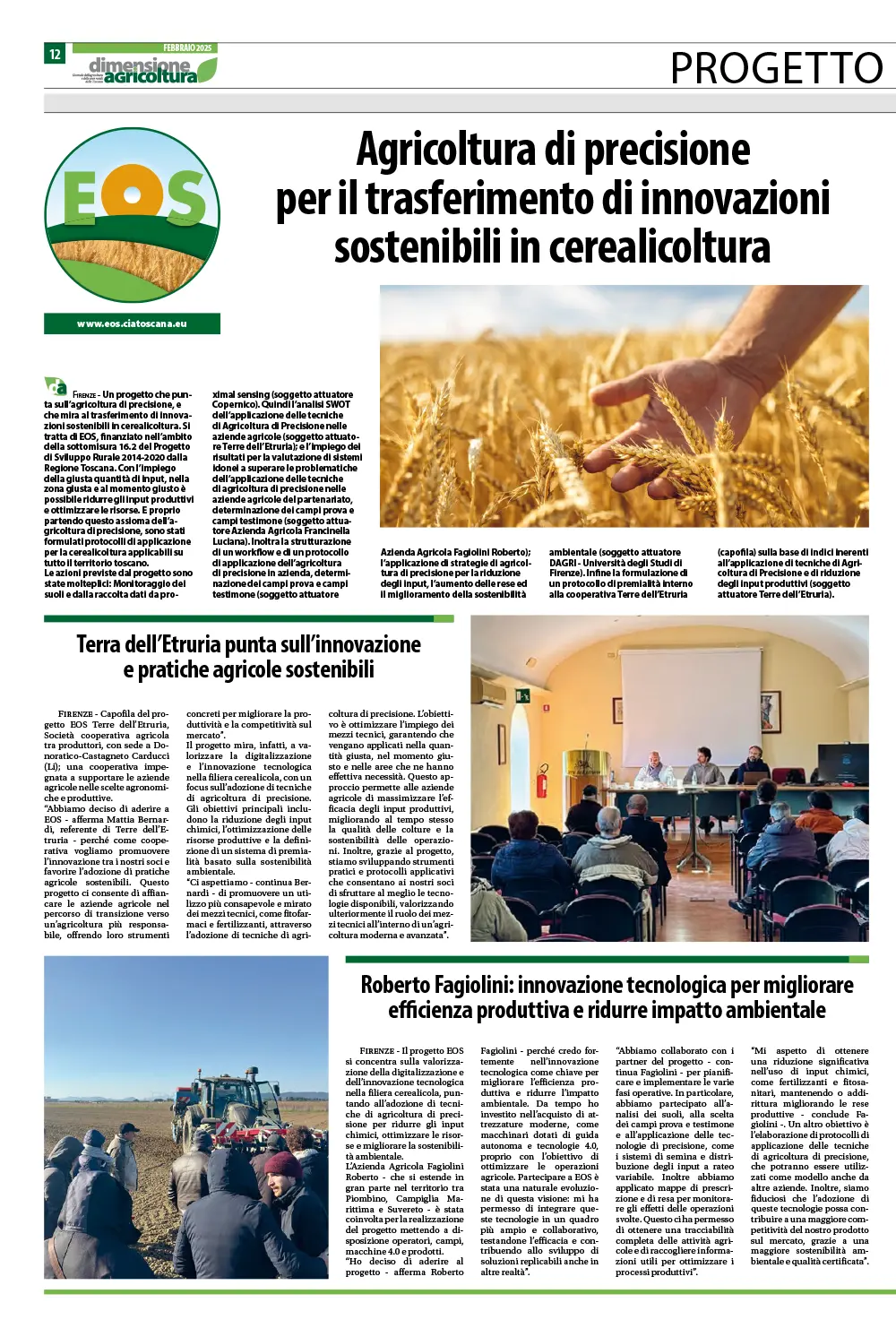 CEREALICOLTURA / È uscito sul periodico Dimensione Agricoltura di febbraio 2025 uno speciale di due pagine dedicato interamente alla cerealicoltura di precisione al centro del progetto EOS.